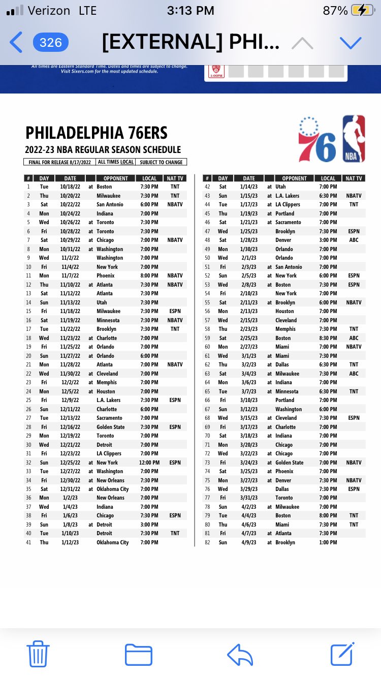 The full 2022-23 schedule is available here Key regular-season matchups ahead of the Feb. October November December January February March. The Philadelphia 76ers released their 2022-23 NBA regular season schedule on August 17. REGULAR SEASON SCHEDULE SUNDAY MONDAY TUESDAY WEDNESDAY THURSDAY FRIDAY SATURDAY. PHILADELPHIA 76ERS 2022-23 NBA REGULAR SEASON SCHEDULE ALL TIMES LOCAL DAY. . On Wednesday the team announced their schedule for the 2022-23 season which kicks off in the first..